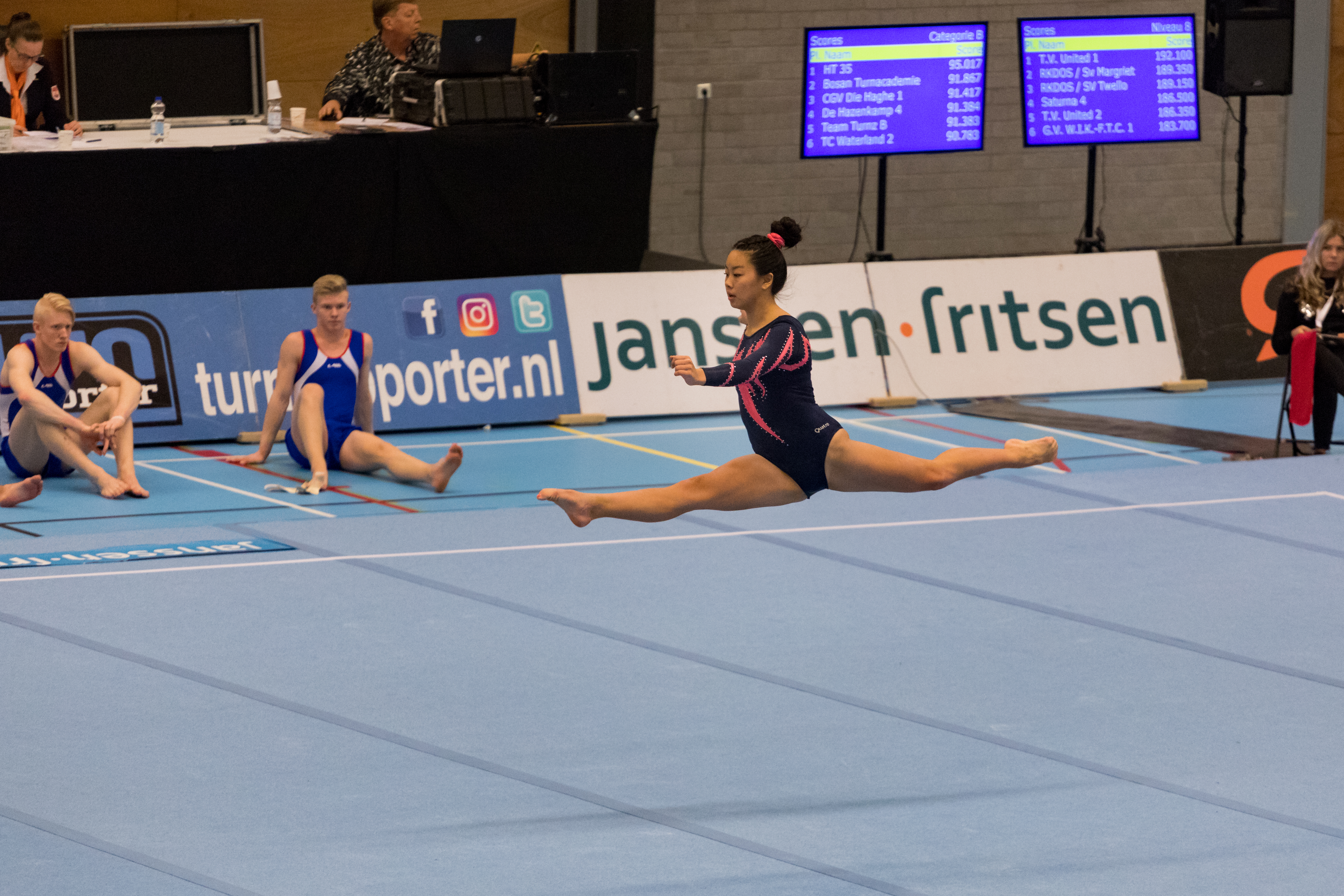 Als laatste knallen op vloer. Ook hier werd er prima geturnd maar de jury kende geen genade bij te lage sprongen. Er werd flink veel voor afgetrokken en dan weet je direct dat het een landelijk podium is. Chloé (10,433), Bailey (11,267) en Sanne (11,967). Deze laatste score was nog wel de 4e van alle deelnemers. Er werden maar weinig twaalven gegeven.