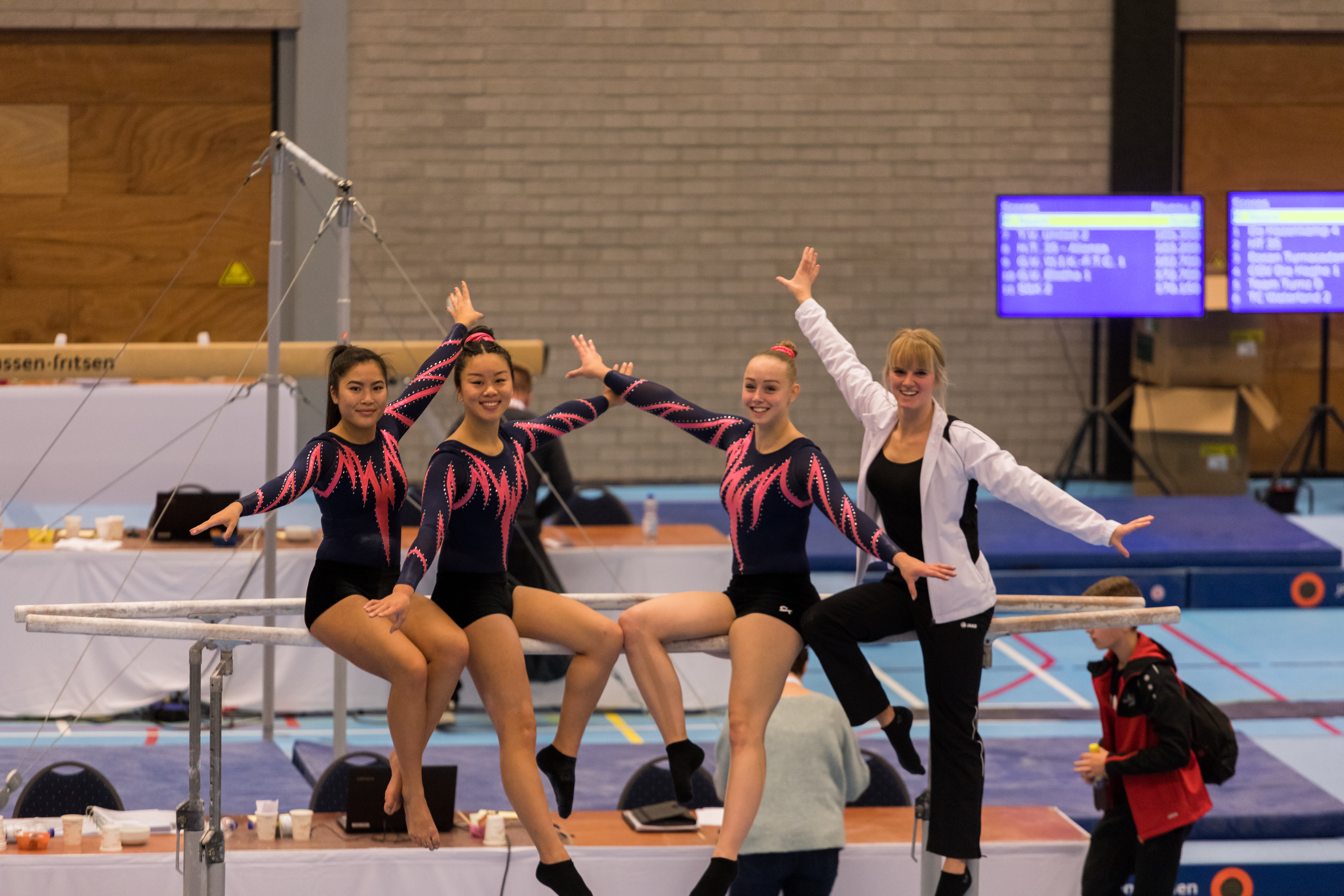 Ook hier weer het concept; drie turnen, twee hoogste scores tellen. Vooraf was door Miranda een indeling gemaakt wie welk toestel mocht turnen. Sprong eerste onderdeel met Hannah, Sanne en Chloé. Bij de landing ging het mis met Hannah; ze viel en raakte geblesseerd en moest de wedstrijd staken. Erg jammer. Dit betekende dat de druk op de schouders van de andere drie lag. De sprongen van Sanne en Chloé gingen goed. Beiden een 12. Op brug probeerde Hannah het nog met inturnen maar het ging echt niet.