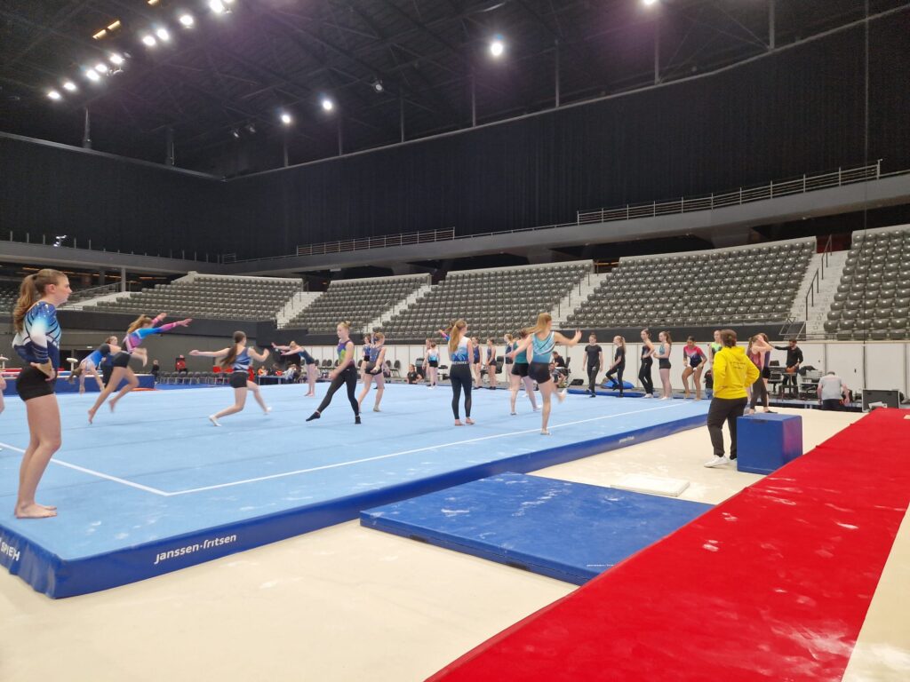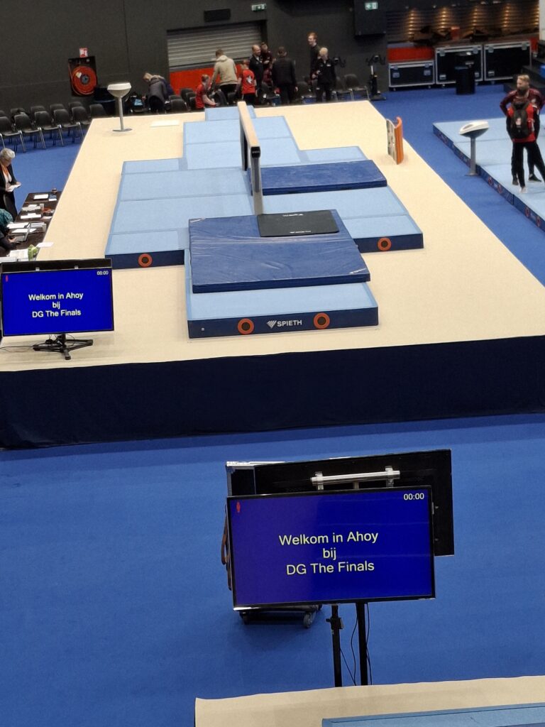 Het begon op donderdag voor Liese met haar podiumtraining. Samen met Les ging zij aan het eind van de middag naar Rotterdam om in de Ahoy Arena volgens straks schema een training te doen en feeling te krijgen met de toestellen. Dat was al een mooie belevenis en het ging er allemaal vrij ontspannen aan toe (nog geen publiek….).