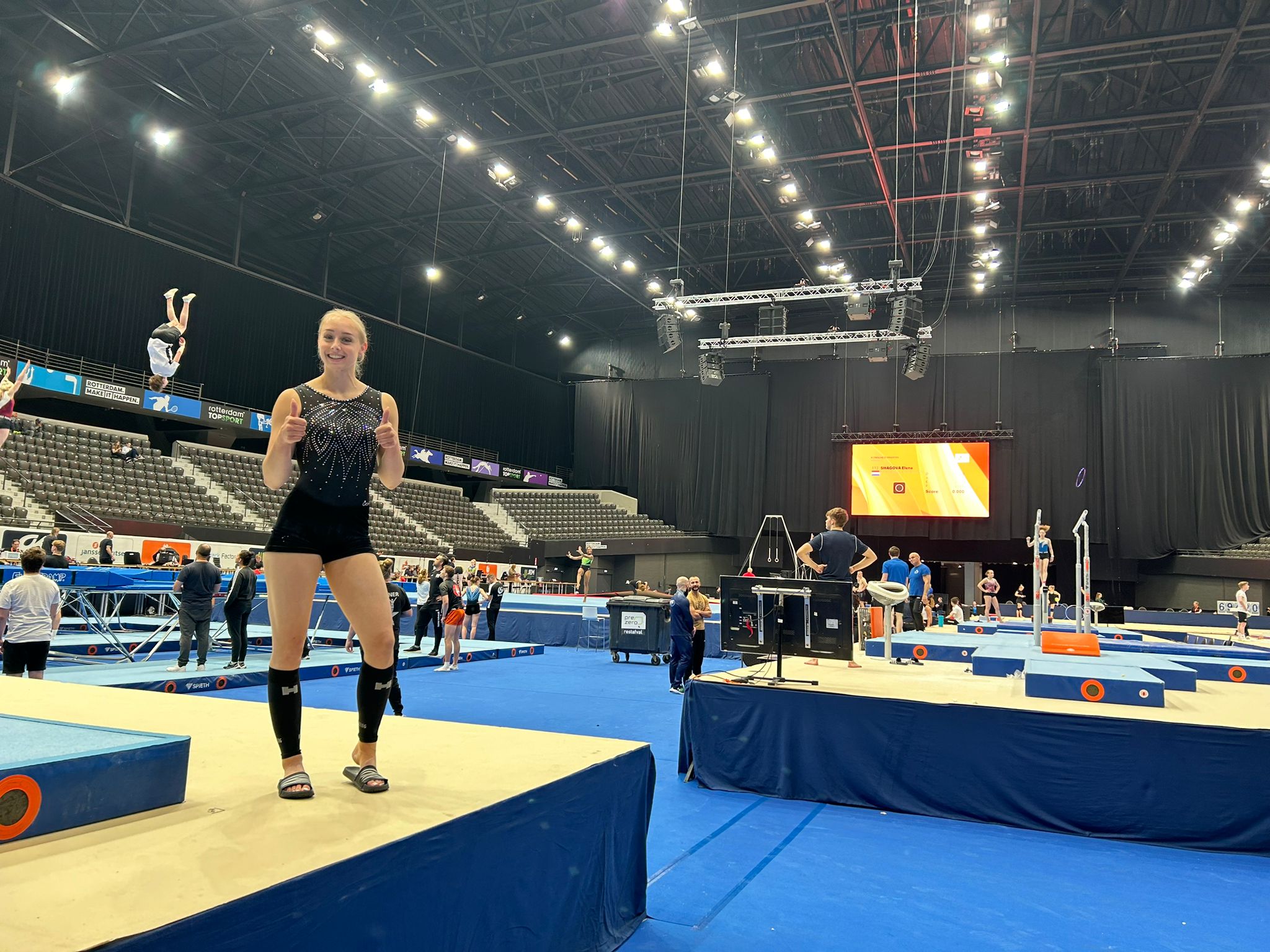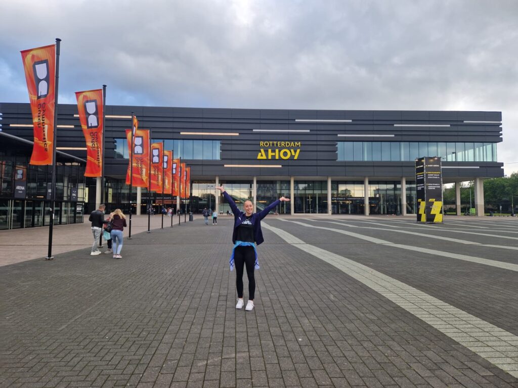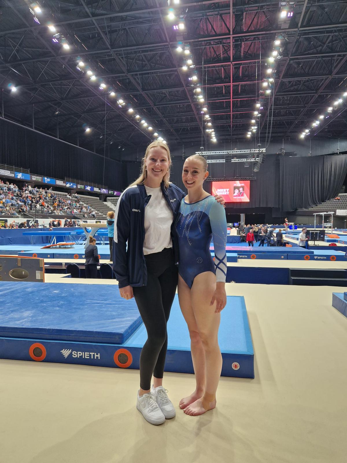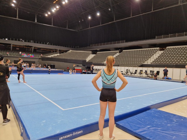 Sanne reisde vrijdagmiddag met Les naar Rotterdam voor haar podiumtraining. Zij was twee jaar geleden ook in Ahoy voor toestelfinales dus was het voor haar niet nieuw maar blijft iets bijzonders. Ook zij kon lekker trainen in de Ahoy-Arena tot 18.30 uur.