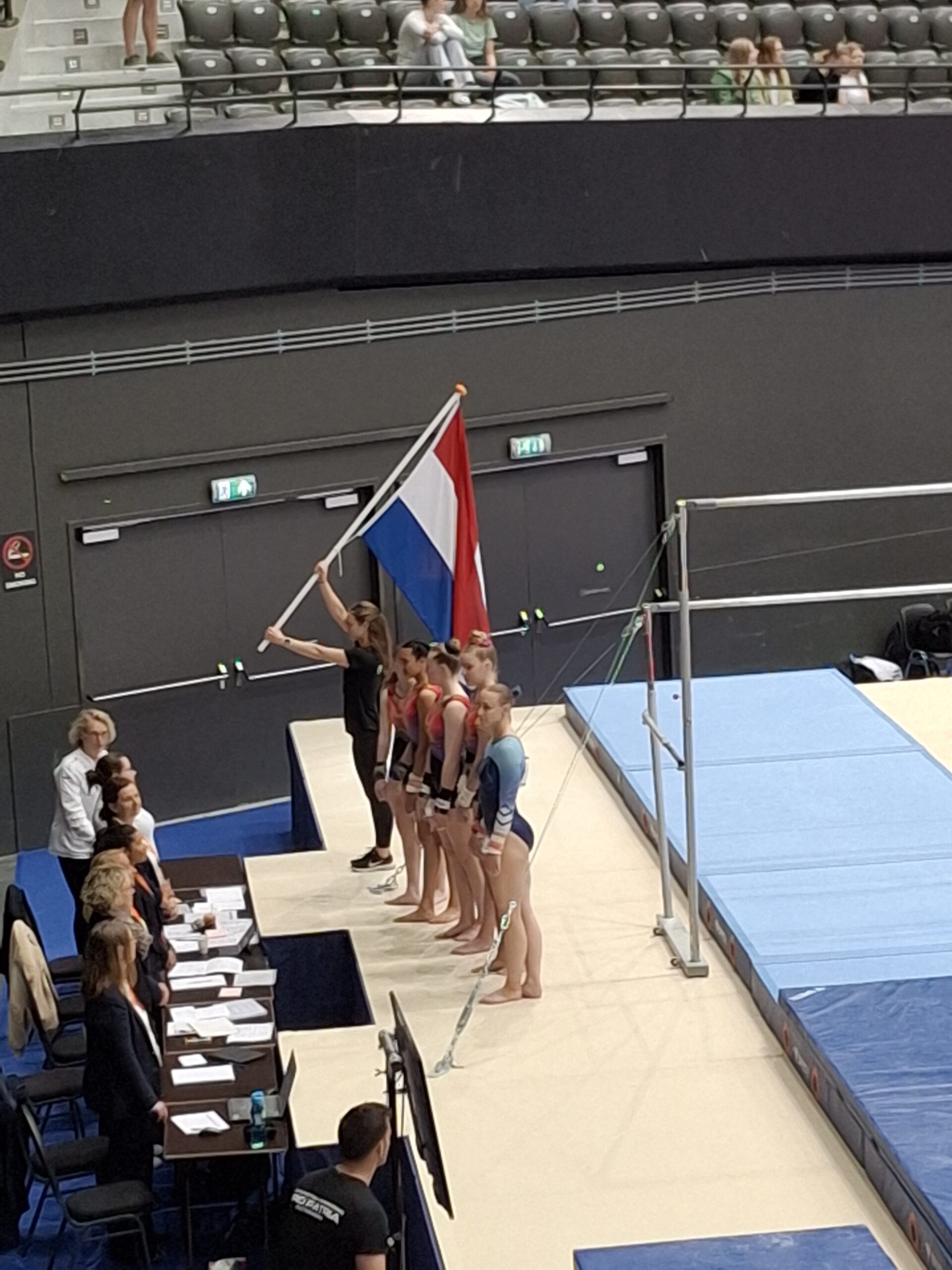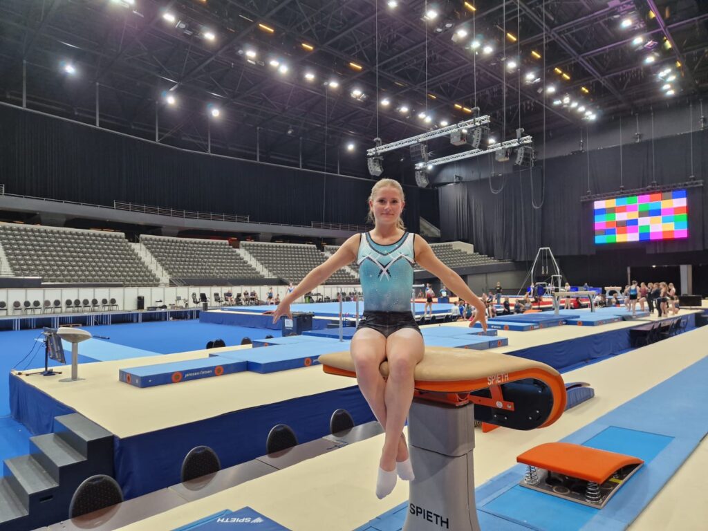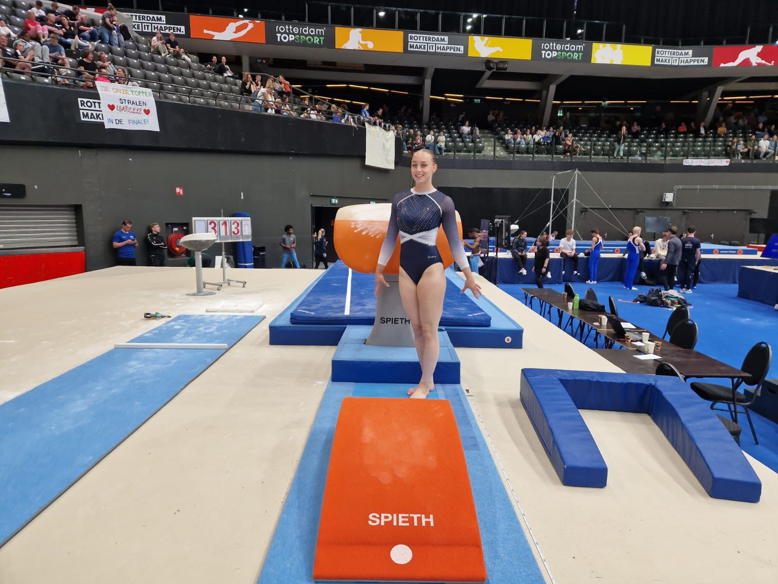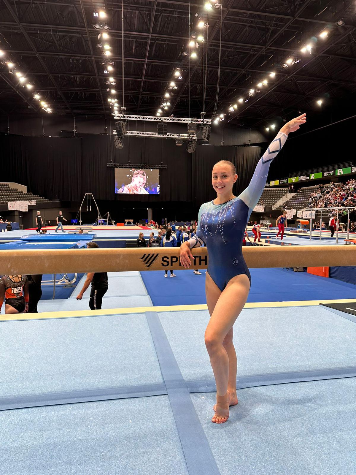 Sanne reisde vrijdagmiddag met Les naar Rotterdam voor haar podiumtraining. Zij was twee jaar geleden ook in Ahoy voor toestelfinales dus was het voor haar niet nieuw maar blijft iets bijzonders. Ook zij kon lekker trainen in de Ahoy-Arena tot 18.30 uur.