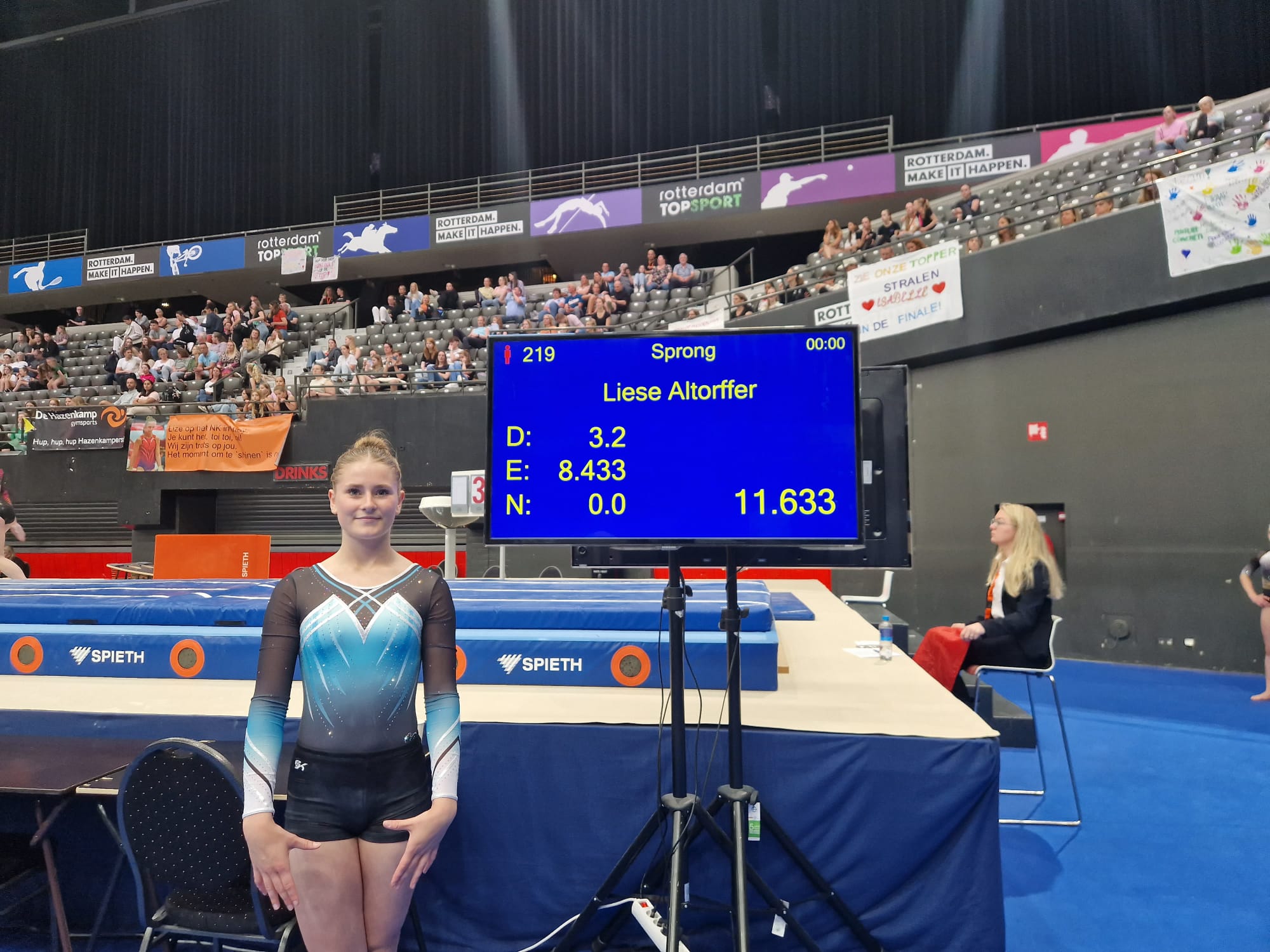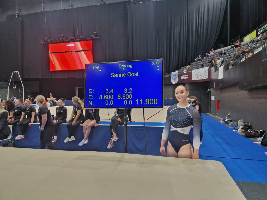 Direct na deze ronde was Sanne aan de beurt voor haar sprongfinale. Tijdens de oefening van Liese had zij ingeturnd in Hal 1. Sanne kreeg voor haar beide tsjuki’s (hurk en hoek) exact hetzelfde cijfer voor de uitvoering (8,600) en haar gemiddelde kwam op 11,900 punten en hiermee behaalde zij een 4e plaats. Ook een geweldige prestatie in dit niveau.