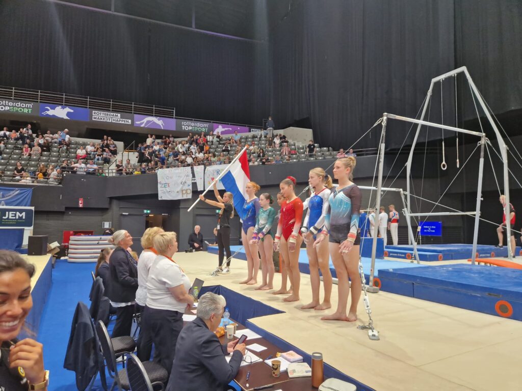 Sanne werd begeleid door Jolijn en rond 09.00 uur begon de meerkamp in supplement A. Brug als eerste onderdeel en op muziek en achter de Nederlandse vlag liepen de groepen naar het eerste toestel. Sanne begon en het ging niet vanzelf. Het was hard werken en hier en daar wat improviseren maar ondanks het missen van twee eisen wist ze toch 10,133 over te houden. Mooie start. Daarna balk en ook hier mist zij een eis in supplement A maar daarentegen deed ze wel een nieuw element, pirouette met geheven been en dat lukte! Een goede oefening en een 11,100. Op vloer een 11,500 en haar tsjuki hoek was goed voor een 12,000.