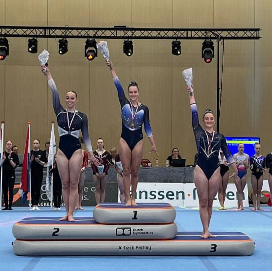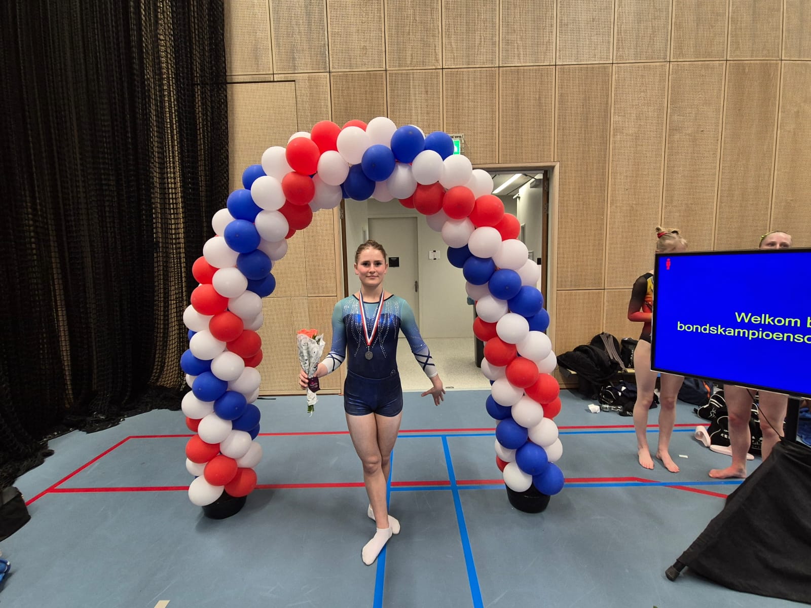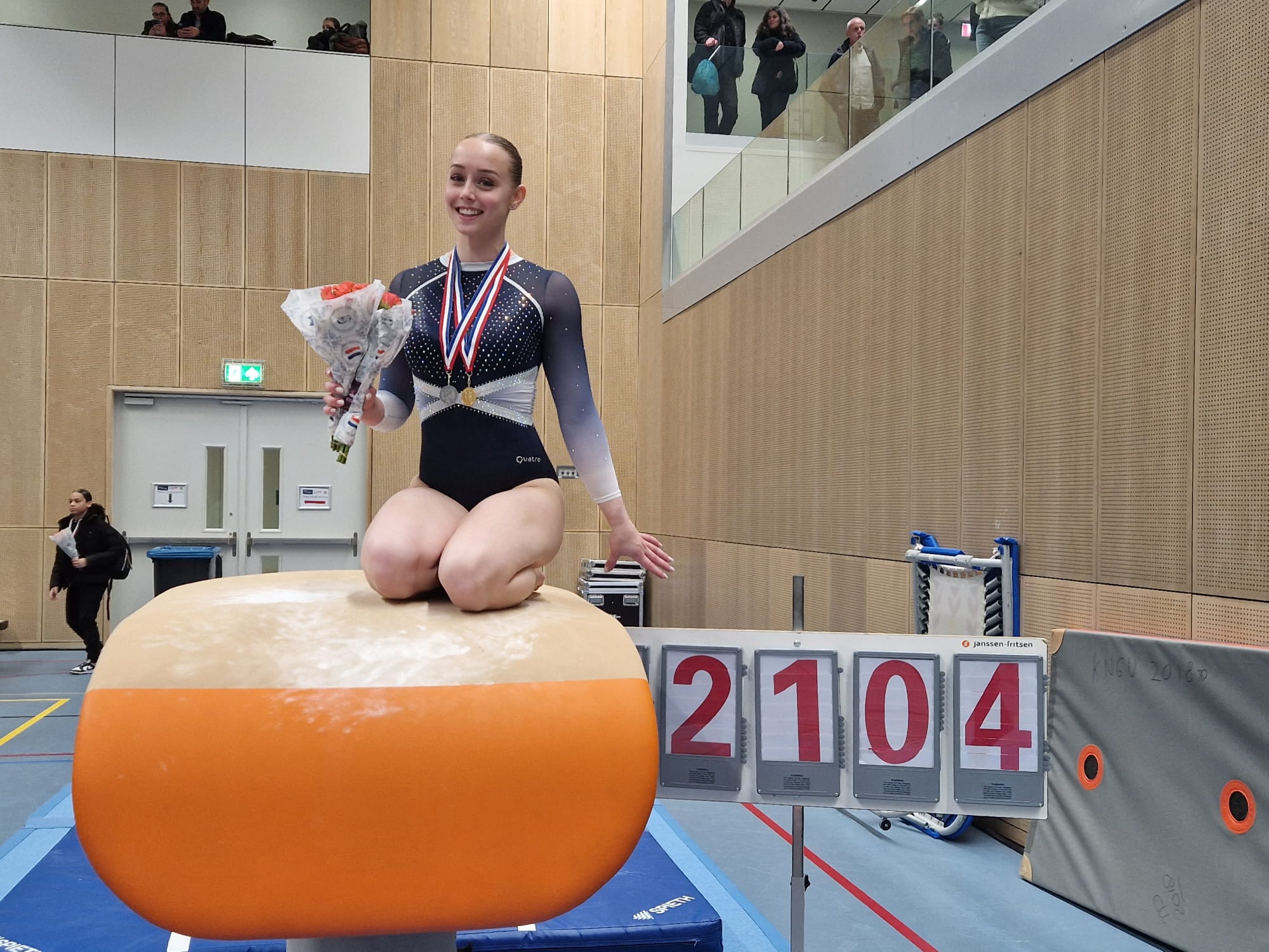 De lange middag werd afgesloten met een feestje want Sanne kwam in actie op sprong en werd op dit onderdeel Nederlands kampioen. Zij sprong als derde en zette 12,225 (tjuki hurk/hoek) neer. Of dat genoeg was….het bleef spannend tot de laatste turnster was geweest maar met een tiende verschil won zij de titel en mag uitkomen bij toestelfinale sprong in Ahoy op 23 juni a.s.