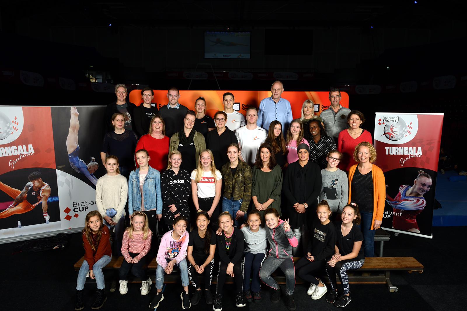 Voorafgaand aan het Turngala mocht onze groep op de foto met drie toppers uit het Nederlands team (Sanna Veerman, Frank Rijken en Bram Louwije).