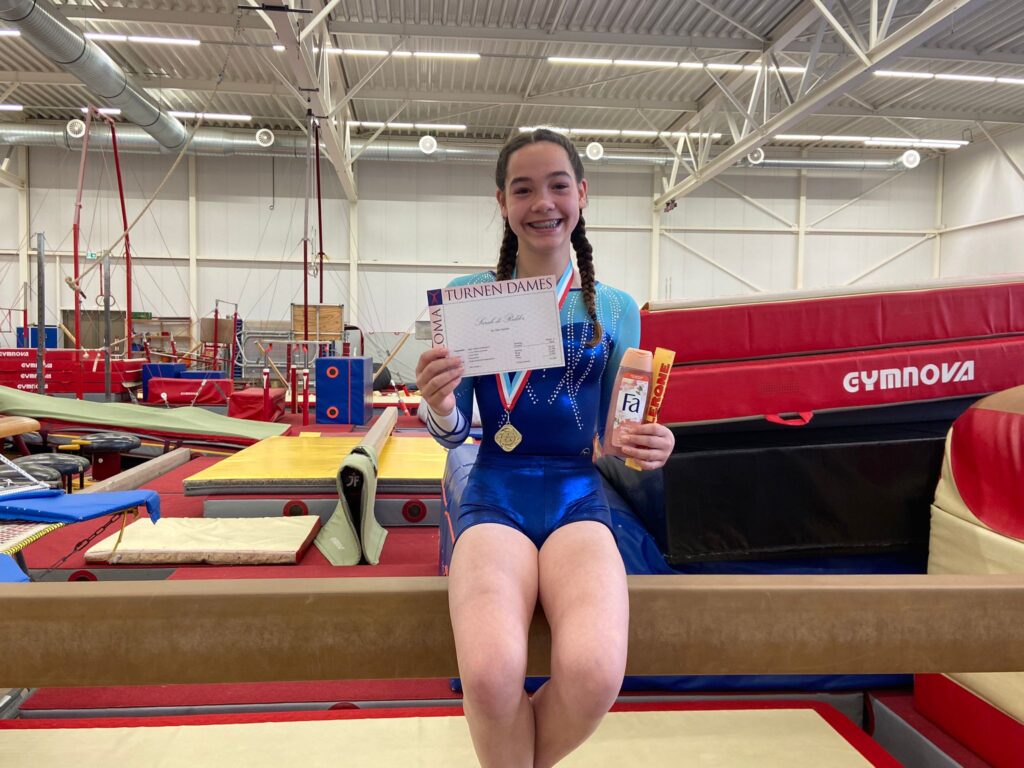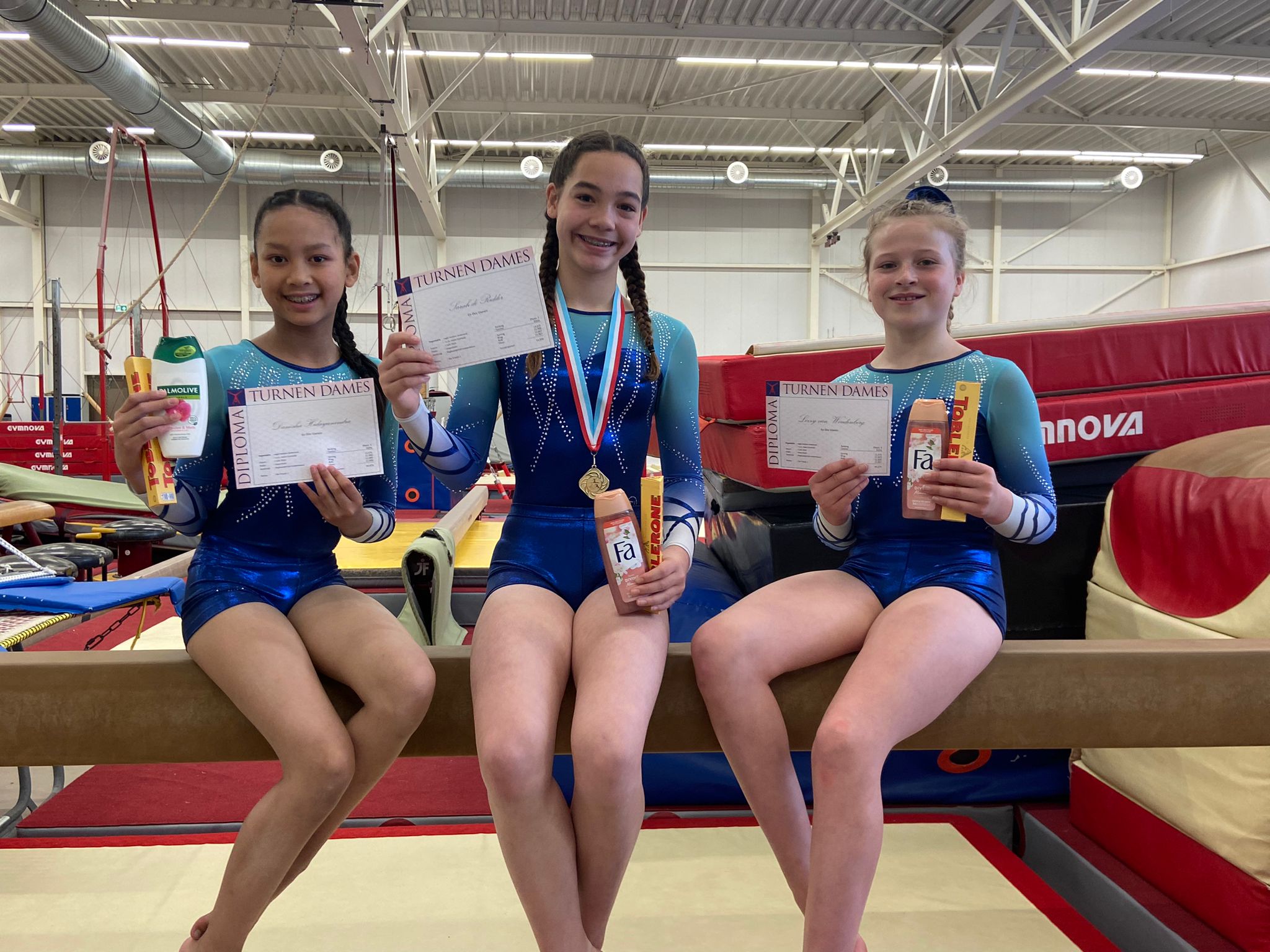 Het trio turnde een sterke wedstrijd; geen van drie viel van de balk. Lizzy was op haar baan 3e op sprong met 12,775 punten. Sarah op de andere baan de hoogste score op sprong (14,125) en tweede op brug. Danesha was met 12,900 punten tweede op balk. Wat deden ze het goed en Sarah won overtuigend deze finale en mag zich Regiokampioen Midden-Nederland noemen! Danesha werd 5e en Lizzy 6e. Knap hoor meiden en gefeliciteerd!