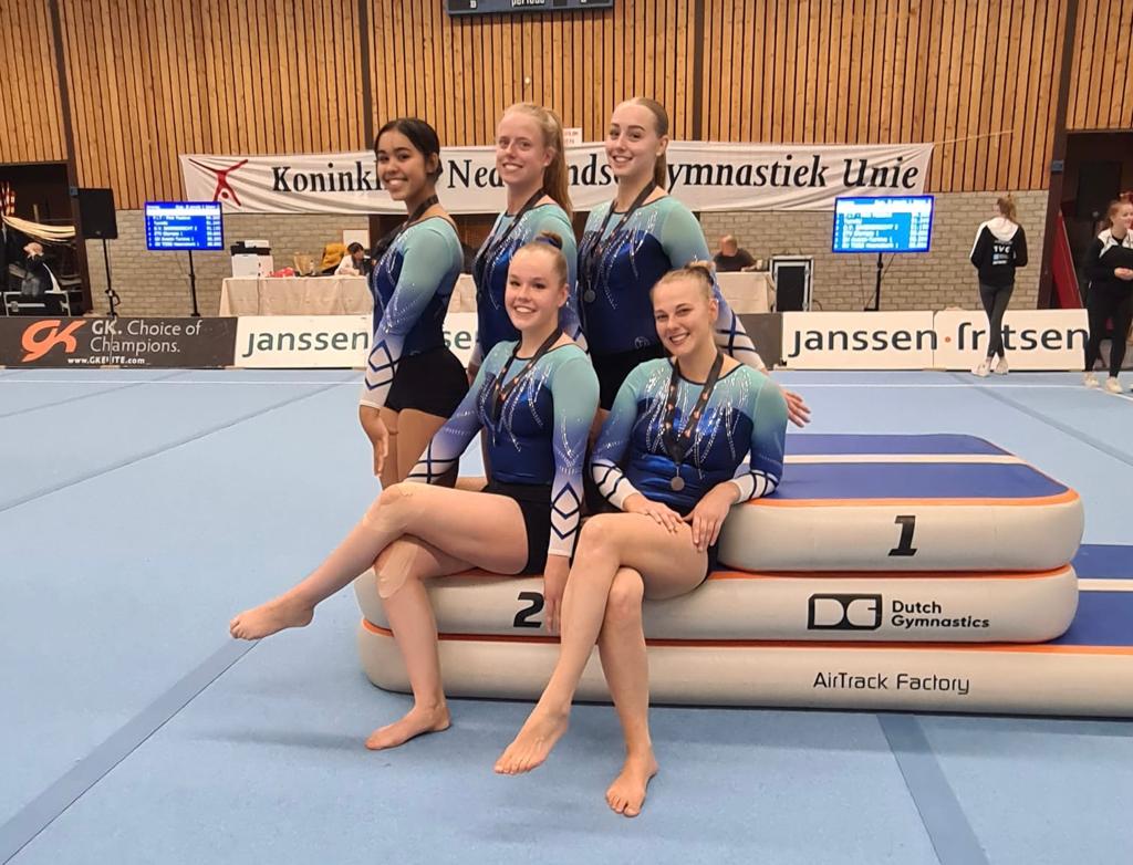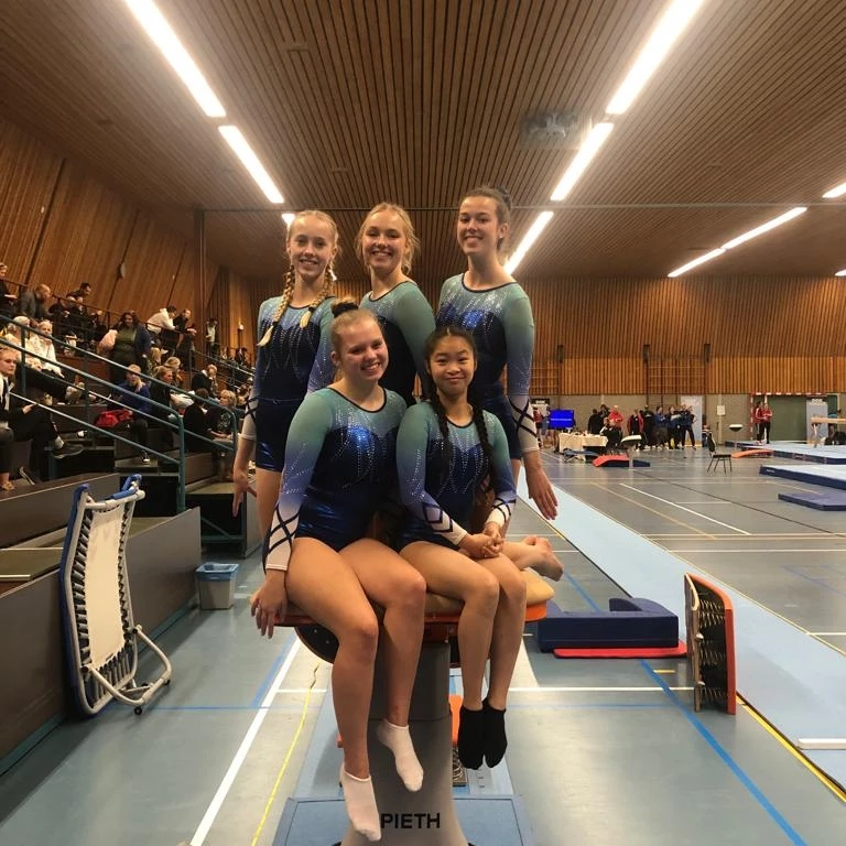 De wekker ging dus vroeg voor Les (trainer), Danique Meijdam, Loïs Verduin, Jolijn van Vliet en Isis Veltman. Met z’n vieren vormden zij een team in supplement C en mochten in de eerste ronde starten. op brug. Drie turnen, twee hoogste scores tellen. Jolijn en Danique zetten mooie scores neer van 10,100 en 10,467. Een goede start. Op balk kon alleen Loïs boven de 10 uitkomen (10.200). Isis, Jolijn en Danique mochten op vloer hun oefening laten zien en kwamen tot 11,133/11,067/11,300 punten. Op sprong haalde Loïs een mooie 11,550. Het werd spannend of er een medaille in zat maar uiteindelijk eindigde dit team op een mooie 4e plaats en heeft hiermee 12 punten voor de ranking gepakt.