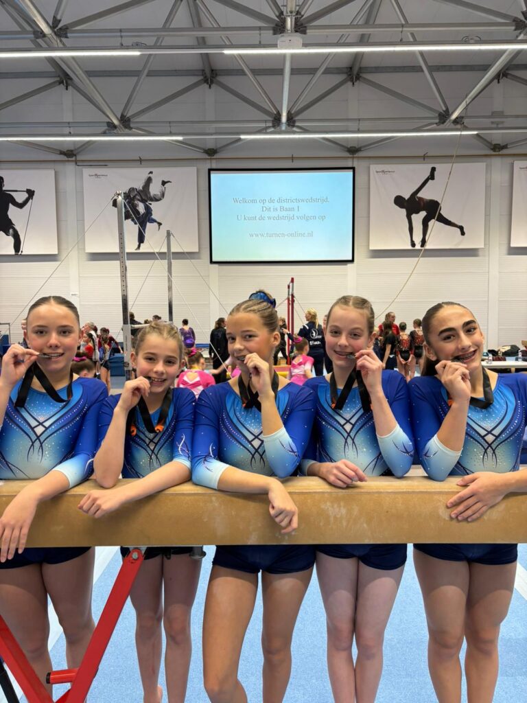 De 1e ronde liep al flink uit dus het vijftal in niveau D begon later aan de wedstrijd en dan ook nog starten op balk. Voor deze turnsters geen probleem. Benthe, Naomi en Simone turnden uitstekende oefeningen waarvoor ze mooie hoge cijfers kregen. Na afloop zou blijken dat zij de hoogste score als team op dit onderdeel hadden. Het sterke begin werd goed doorgezet. Emy liet goede dingen zien op sprong en brug en Puck haar cijfers op sprong en vloer telden ook mee voor het teamresultaat. Zo droeg iedereen haar steentje bij aan het team en het werd spannend of de gouden medaille erin zat. Helaas….het team kwam 0,5 punten tekort maar een zilveren medaille is een fantastisch resultaat voor deze eerste kwalificatie teams.