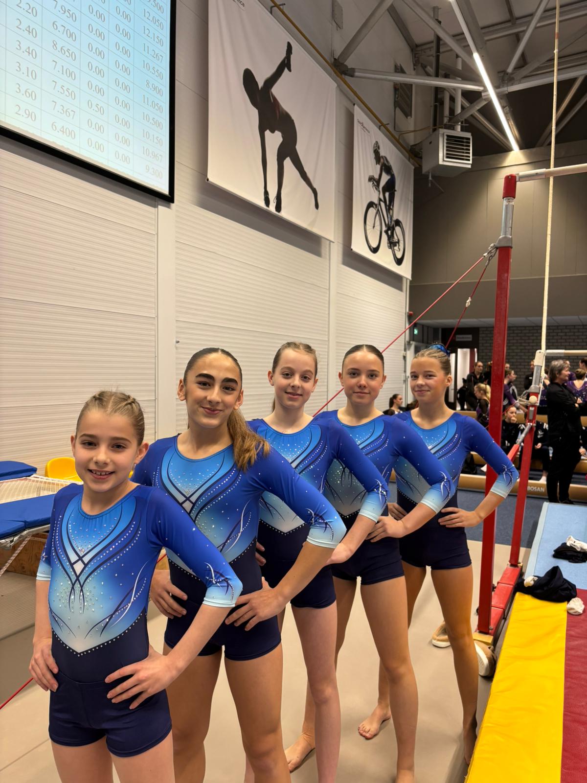 De 1e ronde liep al flink uit dus het vijftal in niveau D begon later aan de wedstrijd en dan ook nog starten op balk. Voor deze turnsters geen probleem. Benthe, Naomi en Simone turnden uitstekende oefeningen waarvoor ze mooie hoge cijfers kregen. Na afloop zou blijken dat zij de hoogste score als team op dit onderdeel hadden. Het sterke begin werd goed doorgezet. Emy liet goede dingen zien op sprong en brug en Puck haar cijfers op sprong en vloer telden ook mee voor het teamresultaat. Zo droeg iedereen haar steentje bij aan het team en het werd spannend of de gouden medaille erin zat. Helaas….het team kwam 0,5 punten tekort maar een zilveren medaille is een fantastisch resultaat voor deze eerste kwalificatie teams.