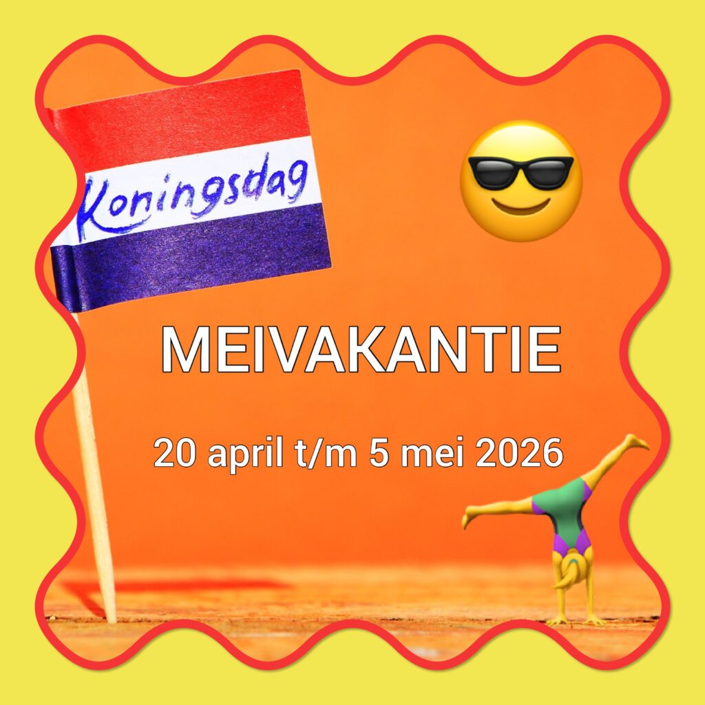 Vanaf maandag 20 april is het meivakantie en omdat sommige scholen dit doortrekken naar 5 mei hebben we besloten dat de lessen weer op woensdag 6 mei zullen beginnen.