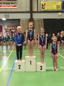 De dag was nog niet voorbij want de pupillen 1, D3 Imane el Hanjri, Yanna v.d. Peijl en Elyne Lommen kwamen nog in actie evenals Femke Verkerk en Indi Heeres bij de jeugd 1 D3. Na de warming-up had Indi toch teveel last van een blessure en liet de wedstrijd aan haar voorbij gaan. Femke had wat goed te maken t.o.v. de vorige keer en mede door goede oefeningen op brug en balk werd ze dit keer 5e en werd beloond met een bronzen medaille.
