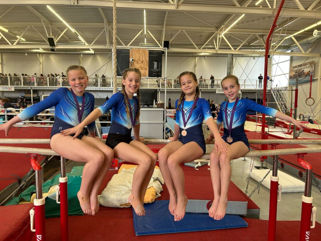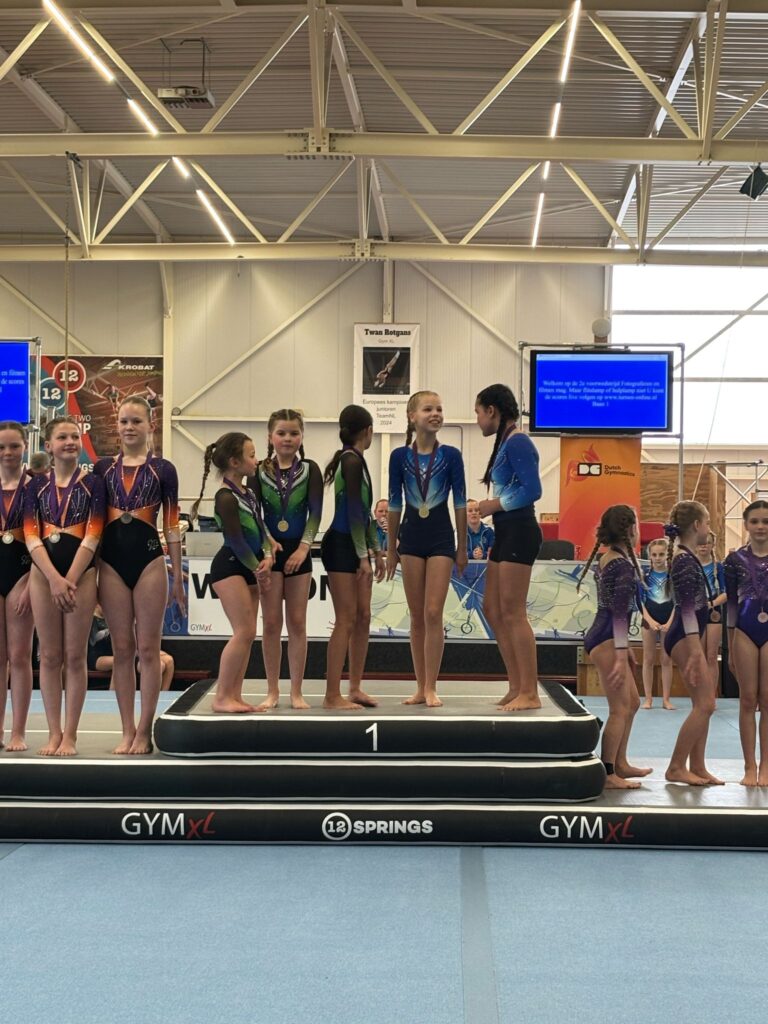 Wat een lekkere start van dit weekend en dan moest ronde 2 nog beginnen. Ook hier een groep niveau 6 (Lindsey van Zanden, Livia Roodschild Koning, Sofie Doeve en Saar Remkes) en een groep in niveau 7 (Guusje van Wingerden, Jip Jolink, Livvy Schouten, Janayah van Dorth, Mara van der Meulen en Puck van Geffen). Ook door deze turnsters werd goed geturnd ondanks dat het best spannend was in deze voor hen nieuwe zaal. Sofie was ook 2e in het individuele klassement. Haar team won in niveau 6 brons met maar 0,2 punten achter de zilveren medaille. In niveau 7 was er wel zilver en eindigde Jip als 4e in het eindklassement.