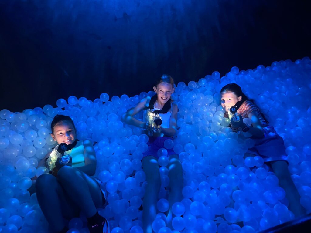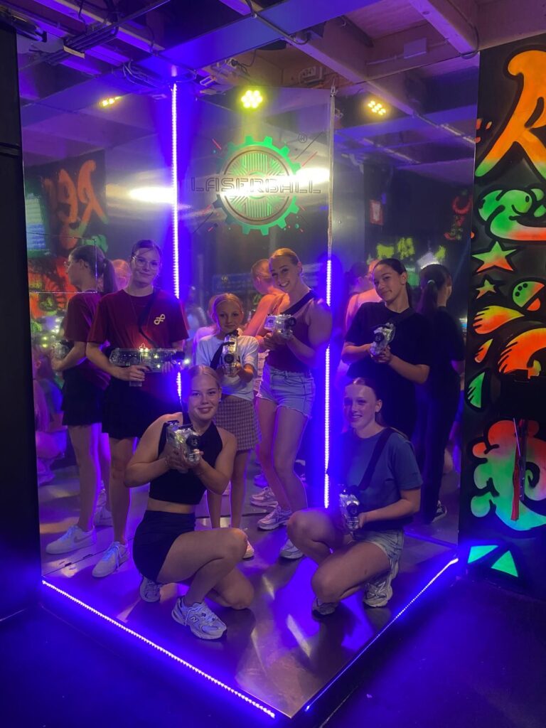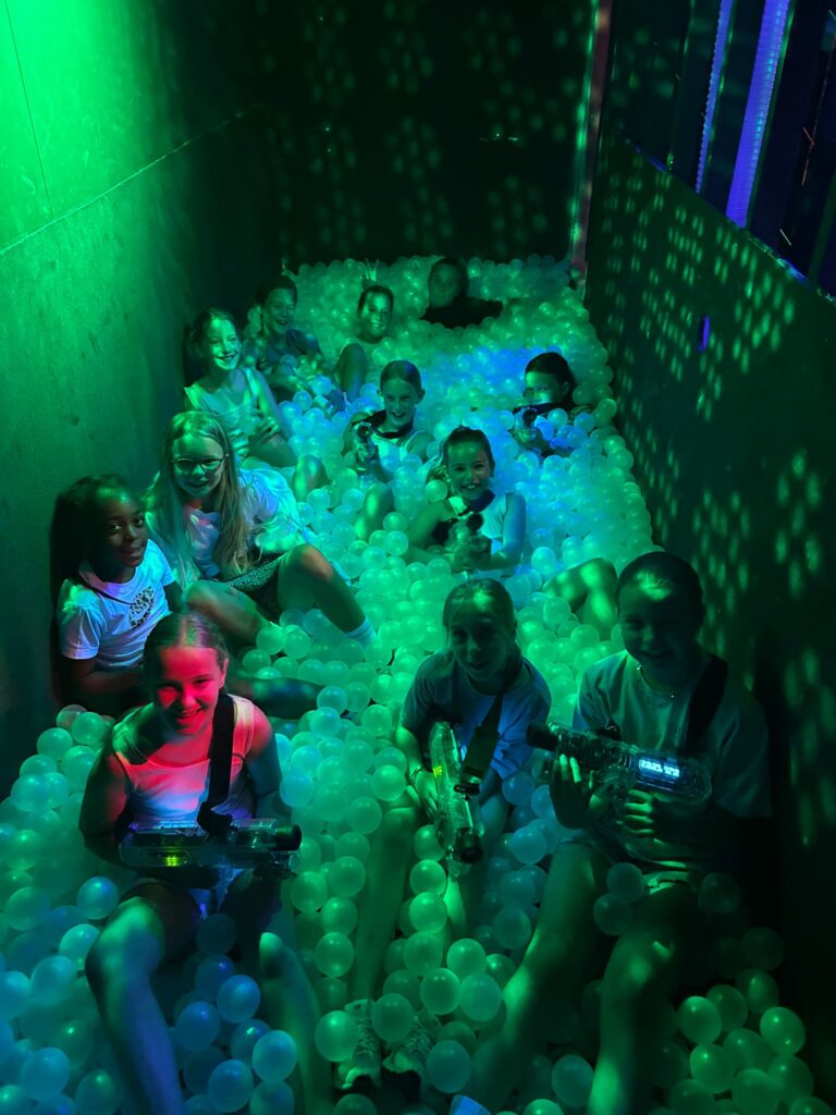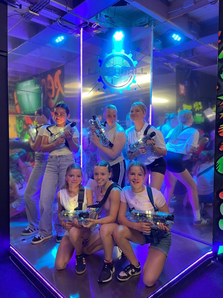 De B-selectie ´groot´ was aan het einde van de middag pas aan de beurt dus voor de trainers/assistenten een mooie gelegenheid om tussendoor even het seizoen te evalueren en vooruit te kijken naar volgend seizoen. Laserbal stond op het programma voor de oudere turnsters. Net even anders dan lasergame met veel spanning, actie en in teamverband werken. Er waren twee teams van 12 en de trainers/assistenten deden zelf ook lekker mee. Het was super leuk en ook voor deze groep na afloop een drankje en een bittergarnituur.