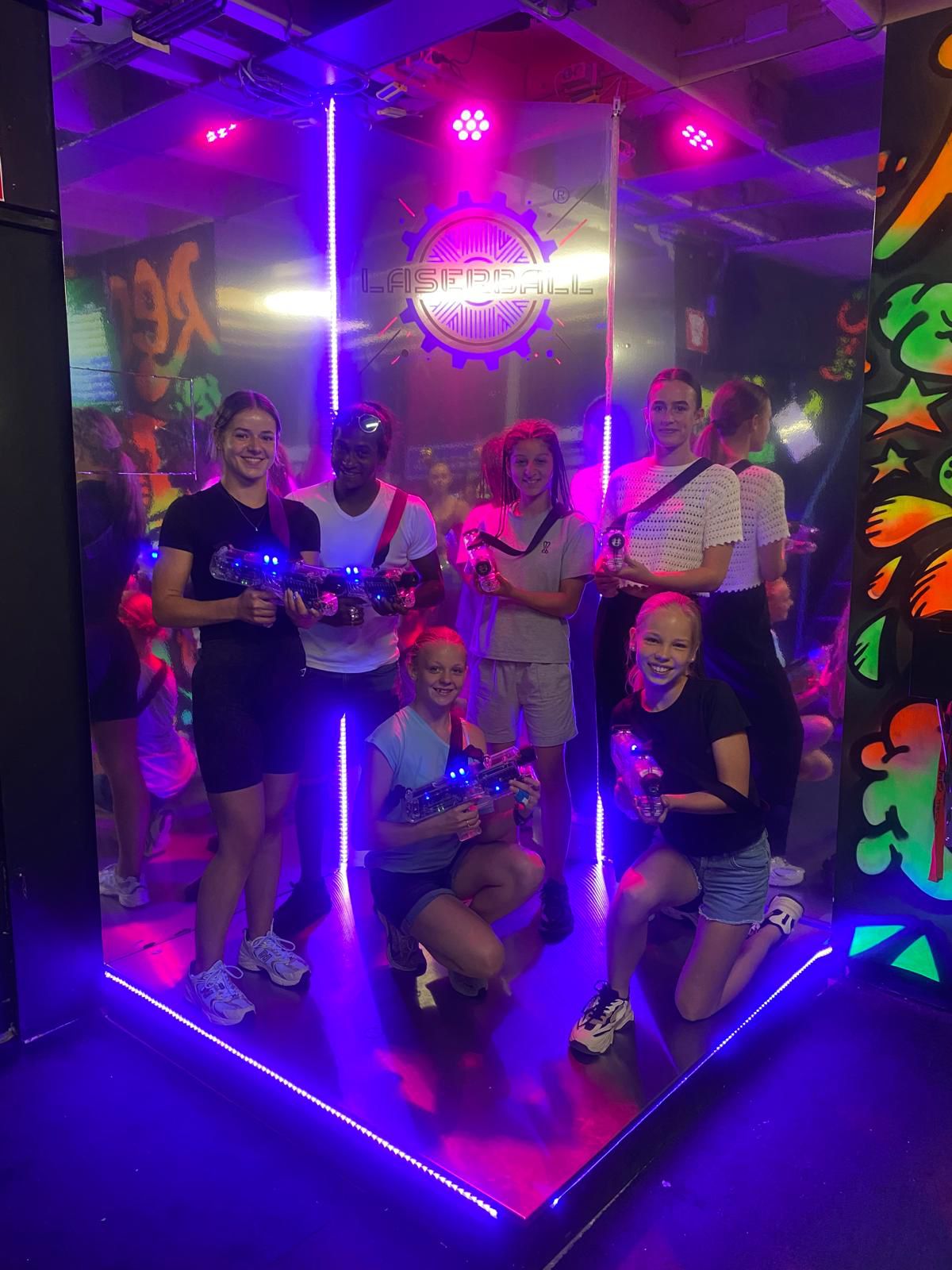 De B-selectie ´groot´ was aan het einde van de middag pas aan de beurt dus voor de trainers/assistenten een mooie gelegenheid om tussendoor even het seizoen te evalueren en vooruit te kijken naar volgend seizoen. Laserbal stond op het programma voor de oudere turnsters. Net even anders dan lasergame met veel spanning, actie en in teamverband werken. Er waren twee teams van 12 en de trainers/assistenten deden zelf ook lekker mee. Het was super leuk en ook voor deze groep na afloop een drankje en een bittergarnituur.