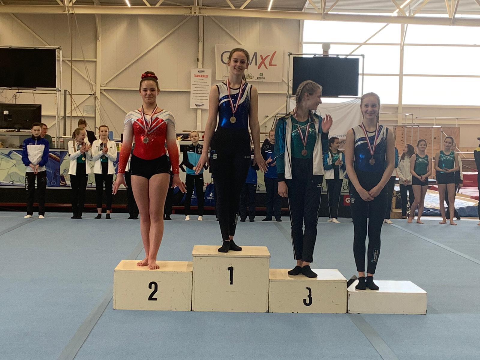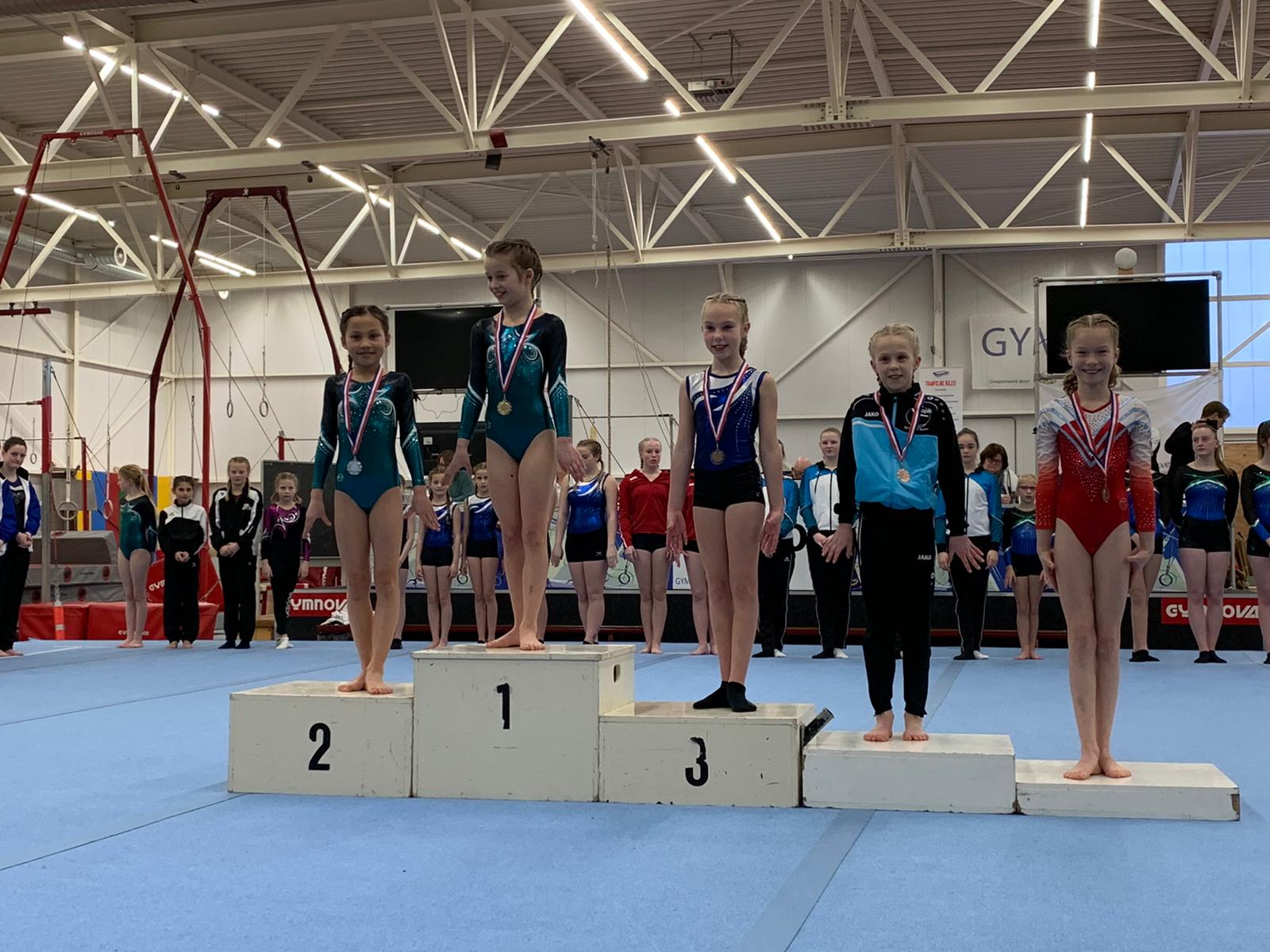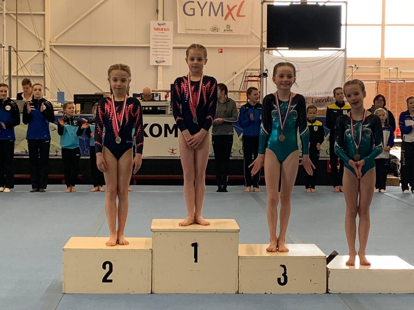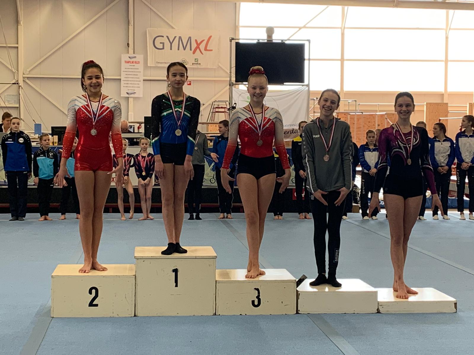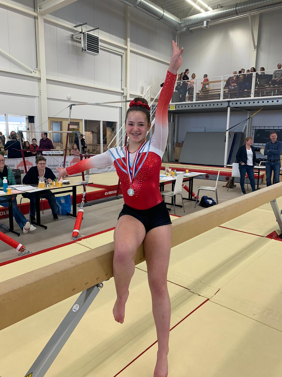 In de laatste wedstrijdronde van deze dag kwam Karlijn Bergevoet nog in actie bij de pupil 2, D1. Karlijn had vorig jaar (bijna) alles gewonnen in de D2 waardoor zij dit seizoen een stapje hoger gaat naar de D1. Spannend hoor hoe dit zal gaan. Karlijn begon op vloer en bam direct de hoogste score met 13,150 punten. Ze turnde erg netjes. Op sprong ook hoge punten voor haar uitvoering en haar 12,975 punten was de derde score. Karlijn ging lekker evenals op brug. Niet veel plusjes geturnd maar goede uitvoering dus dan kom je er ook. Een val met de radslag van de balk was jammer maar er vielen er veel meer dus dat geeft op zich niks. Maar Karlijn vergat een element wat haar 2 punten neutraal kostte. Erg sneu want een top drie had er in gezeten. Nu werd het een 5e plaats waarvoor ze ook een medaille kreeg. Een zeer knappe prestatie in dit niveau en ze weet dat er nog meer in zit. Ook zij turnt op 28 maart haar tweede wedstrijd.