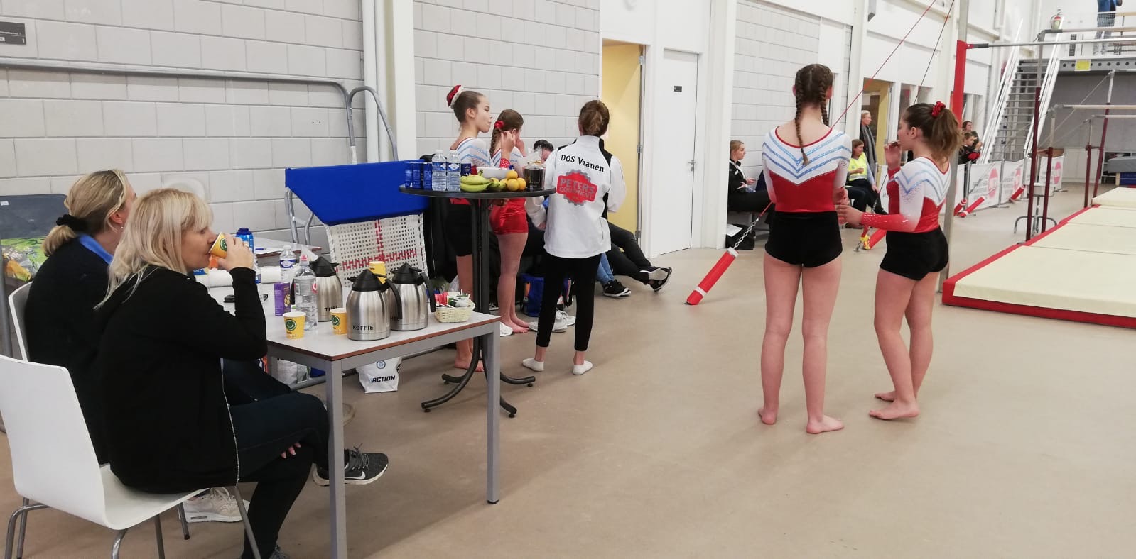 De wedstrijd liep nog verder in. Er werd een half uur gepauzeerd. Onze vrijwilligers konden even genieten van de broodjes, drinken en versnaperingen wat we uit Vianen meegenomen hadden. Ivon was inmiddels ook gearriveerd want in ronde 3 op beide banen turnsters van DOS.